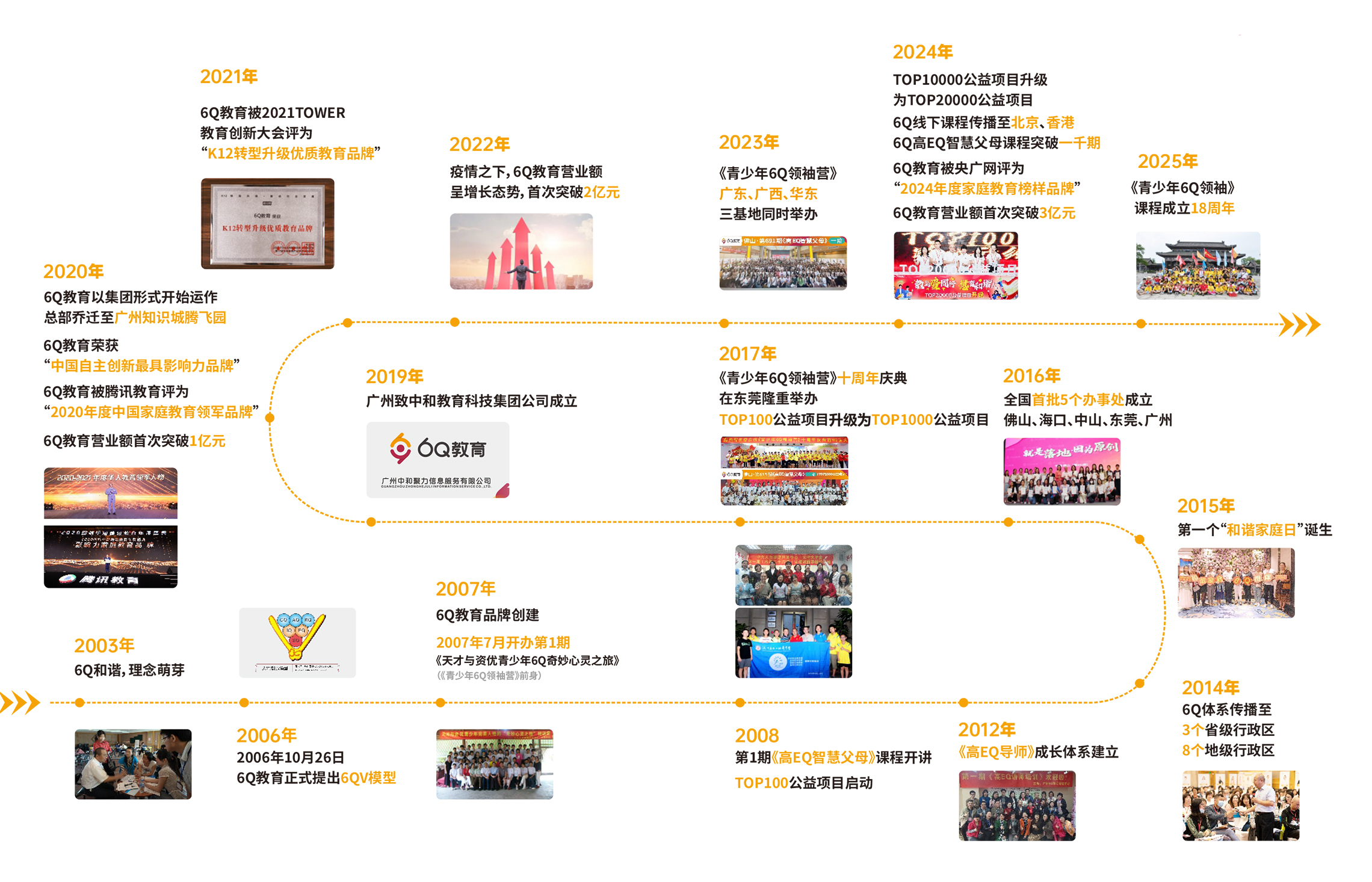 6Q教育创⽴于2003年,是深耕20多年的原创教育品牌,总部位于⻛景秀丽的⽺ 城⼴州(中新知识城)。6Q教育拥有⼀套独特的⼈才培养路径,即培养⼈的德(SQ)、智(IQ)、体(AQ)、美(CQ)、劳(RQ)、情(EQ),促进⼈的“⾝、⼼、灵”和谐发 展。6Q教育凭借卓越的教育理念与实践成果,荣膺央⼴⽹“2024年度家庭教育榜 样品牌”称号。